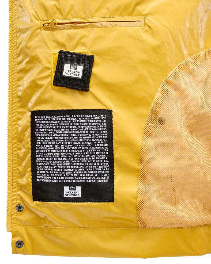 Il tessuto è un nylon 100% a trama ultrafine, trattato con finitura metal-effetto “foil” per dare un look moderno, e con rivestimento DWR per renderlo resistente a pioggia leggera e vento.