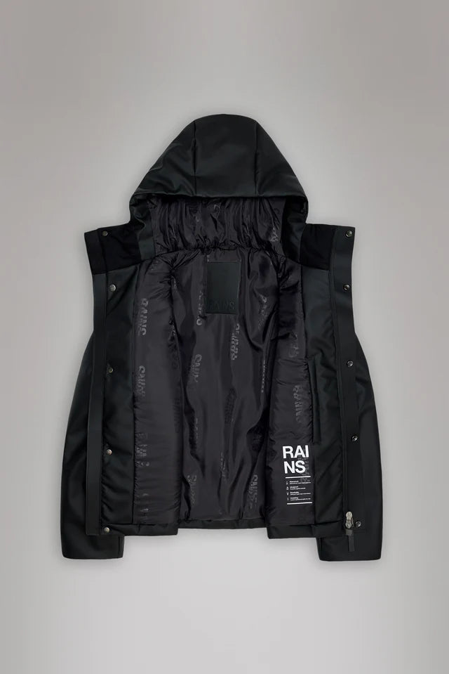 Realizzato con il tessuto PU impermeabile “signature” di Rains (con supporto tessile sul retro), offre una finitura liscia e resistente, ideale per resistere a pioggia leggera e vento.