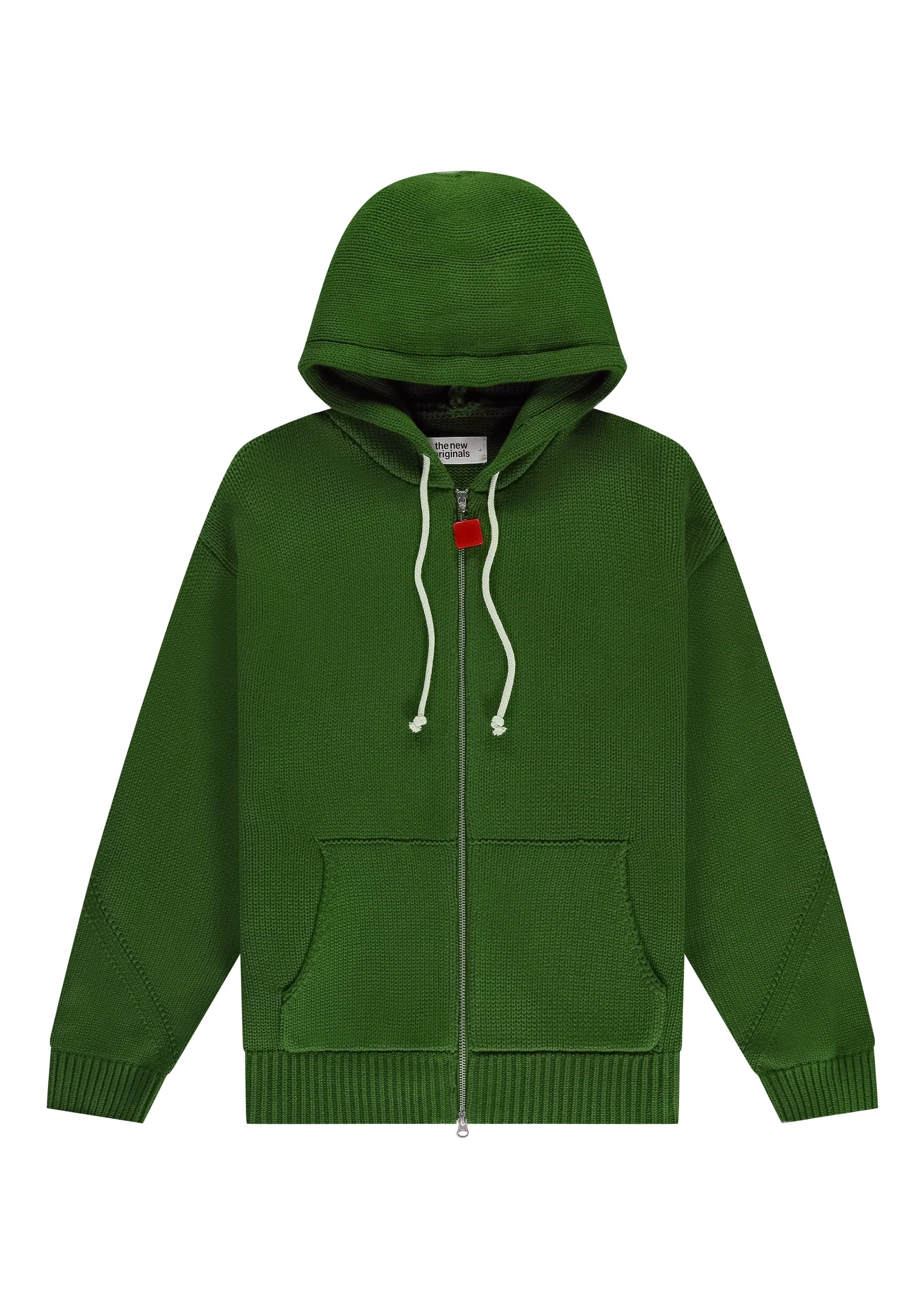 Cappuccio con coulisse color panna (cream drawstrings), che aggiunge contrasto elegante al verde scuro Forest Elf, completato da un dettaglio bead rosso su una delle estremità.