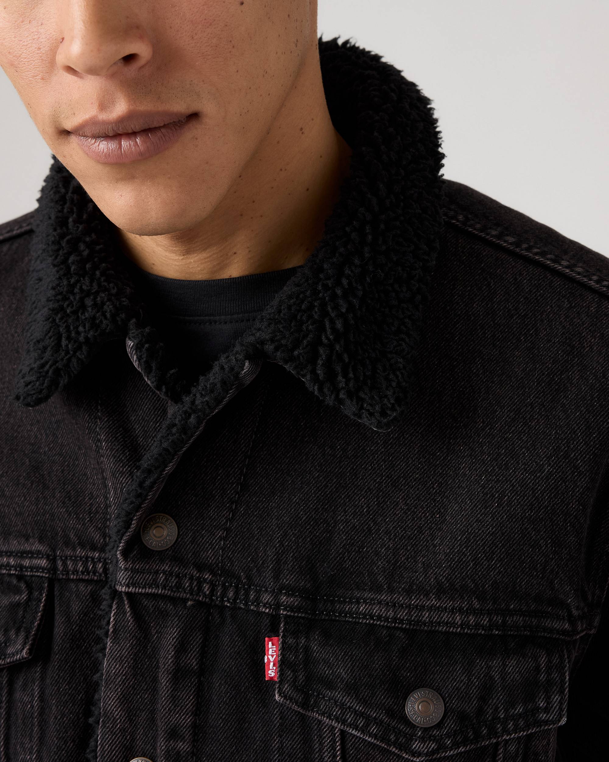 Iconica giacca Levi’s® Sherpa Trucker Type III in robusto denim 100 % cotone con fodera sherpa morbida e calda che la rende perfetta anche nelle stagioni fredde.