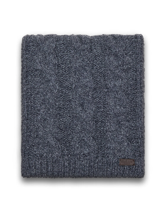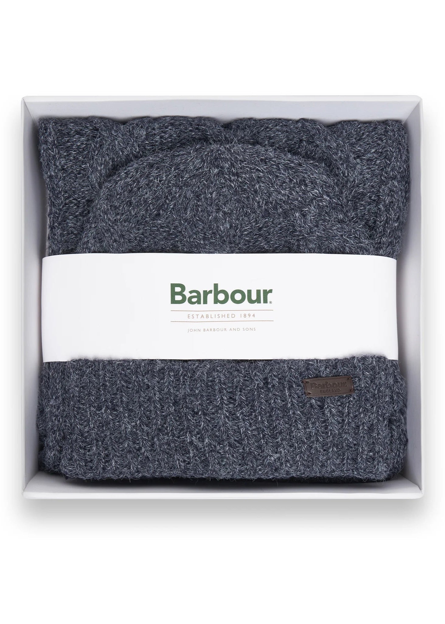 Include un beanie e una sciarpa coordinati in maglia lavorata “cable knit” realizzata con filato morbido mélange, presentati in una confezione premium Barbour.