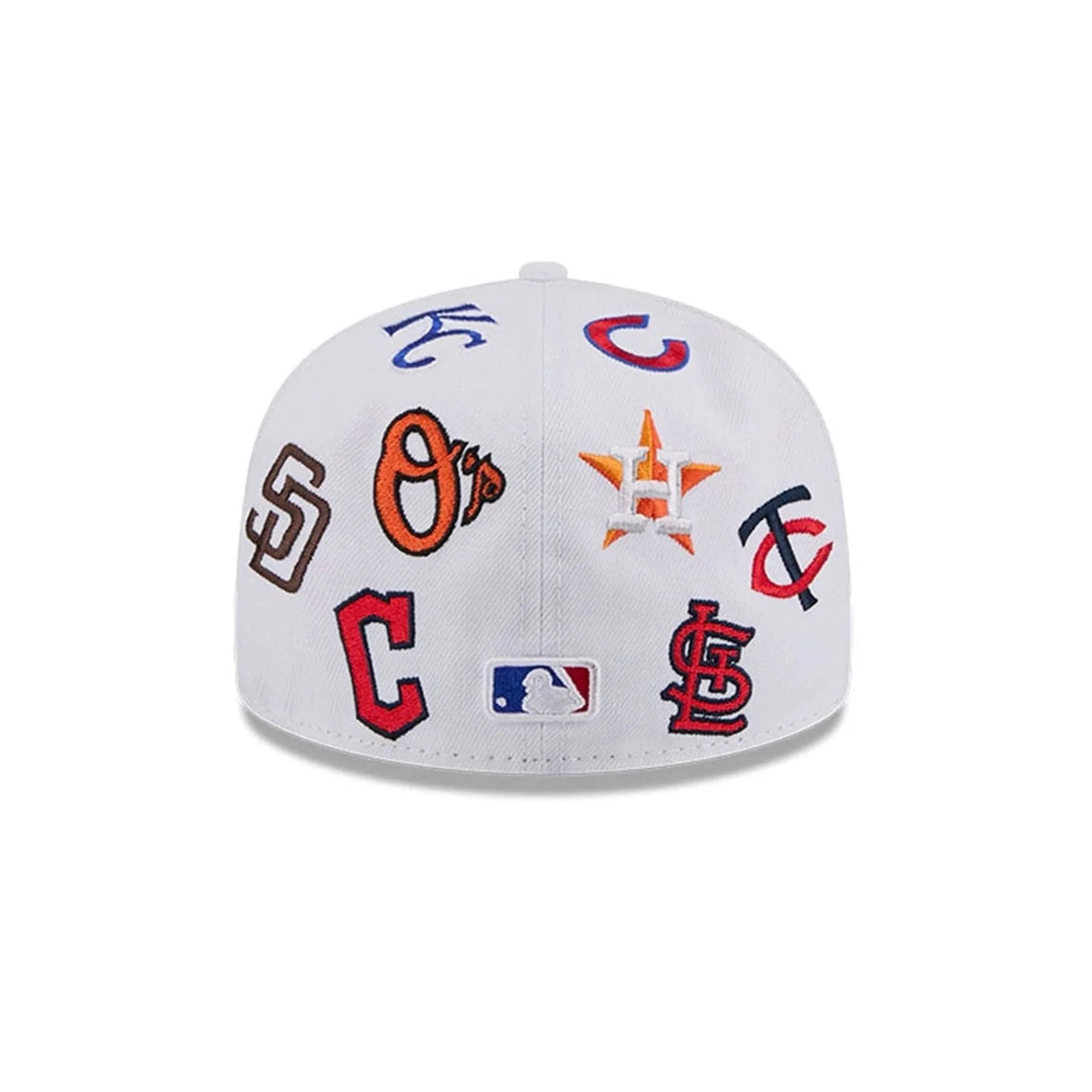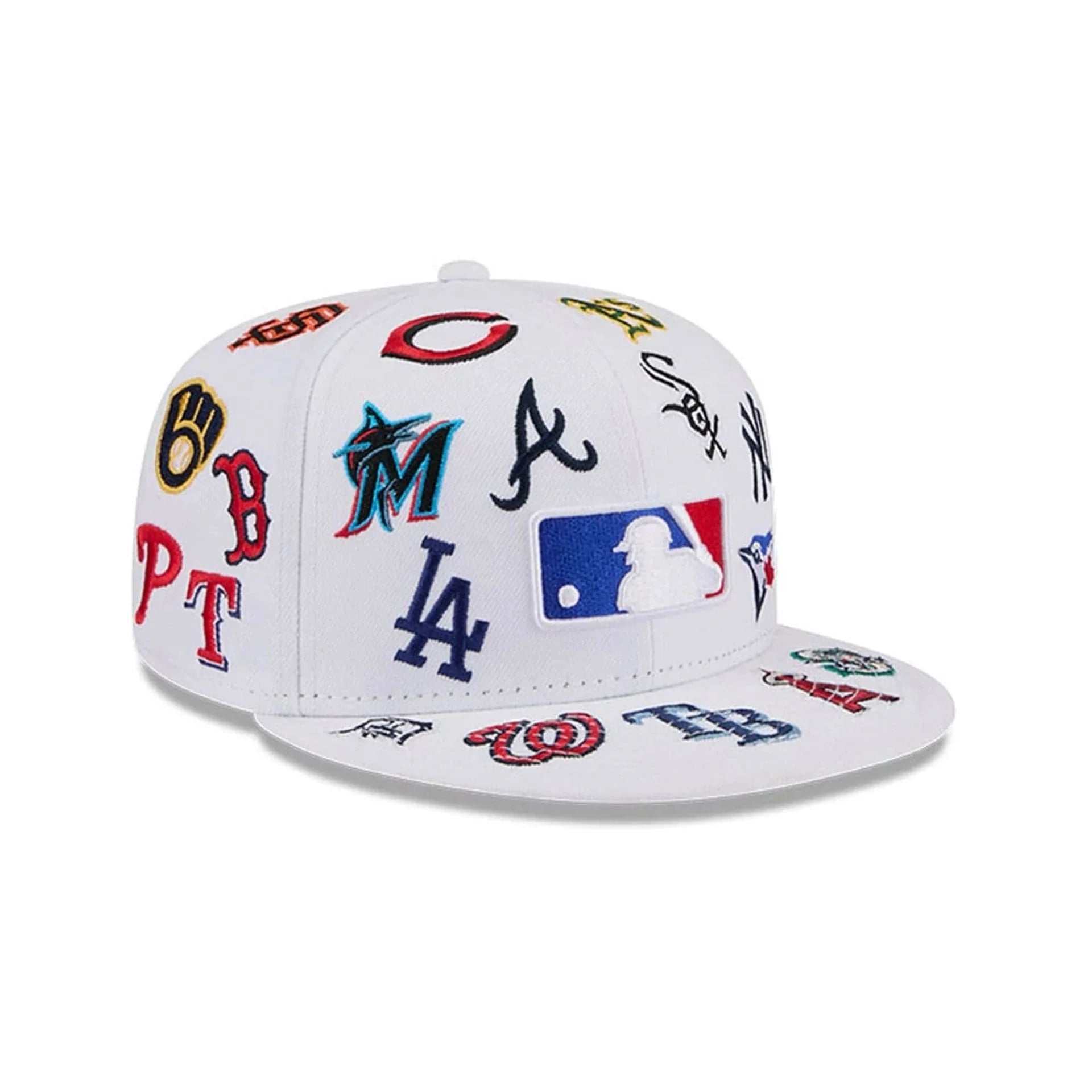 Il design “All Over” è caratterizzato da ricami multicolor ispirati ai loghi MLB distribuiti su tutta la superficie, creando un effetto grafico forte e contemporaneo