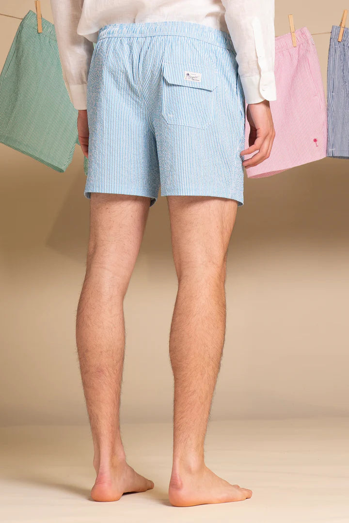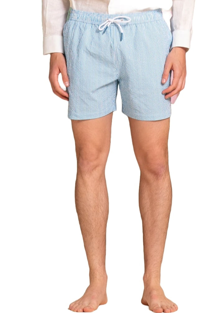 The Rio Seersucker Swim Short by IMPURE is the ideal costume for those seeking a balance between retro style and modern comfort.