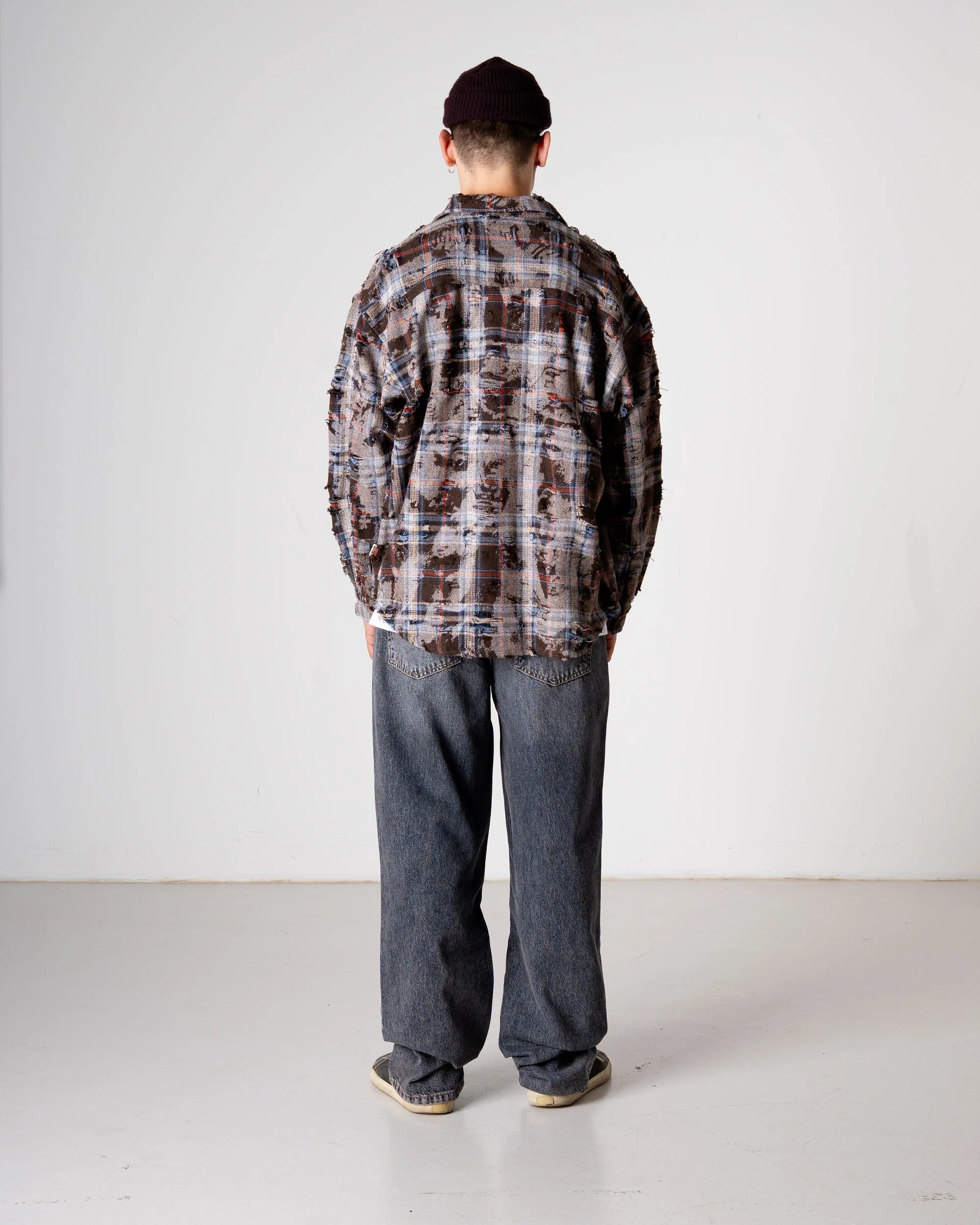 Realizzata al 100% in cotone, presenta un tessuto “ripped” (con strappi), effetto vissuto (“worn look”) e motivo check marrone slavato che dona carattere.