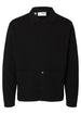 Realizzato in maglieria nera con colletto piatto (flat collar), presenta chiusura frontale con bottoni, taschino al petto (“patch pocket”) e ulteriori tasche laterali, utili e comode per l’uso quotidiano.