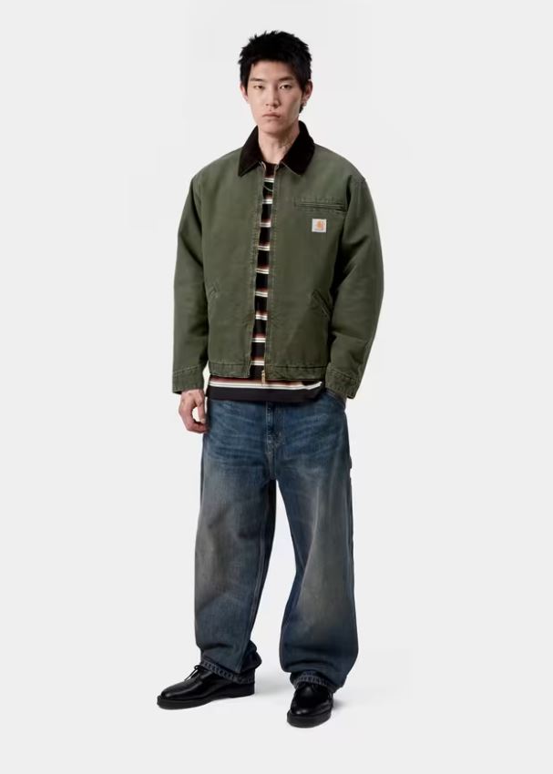 La Carhartt WIP OG Detroit Jacket Olive / Black Stone Canvas è una giacca dal carattere robusto e versatile, ideale per chi cerca un capo utility con finitura vintage.