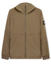 La costruzione prevede un cappuccio a tre pezzi con visiera e coulisse regolabile, zip frontale a tutta lunghezza e tasche laterali con zip e cursori branded — ideali per custodire sicuro smartphone e altri oggetti.
