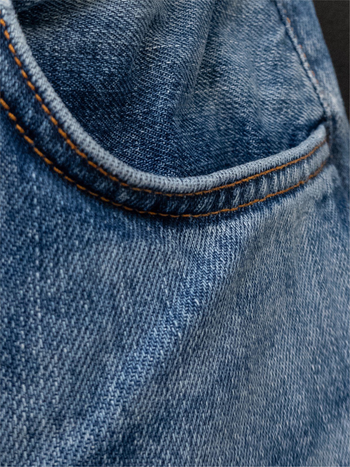 Denim 100% cotone biologico rigido (senza stretch), che con l’uso si ammorbidisce e sviluppa patina personale.