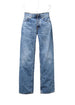 Realizzati in denim rigido (≈ 13,5 oz) di cotone biologico, questi jeans presentano un lavaggio mid-blue brillante con evidenti riflessi quasi bianchi nelle zone di maggiore usura, texture slub verticale accentuata e dettagli vintage quali bottoniera a tornillo e cuciture arancioni.